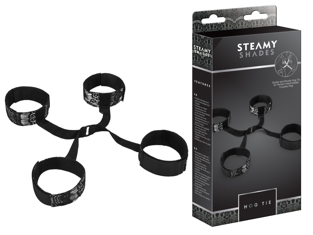 Stabiler Hog Tie für Fesselungsspielchen (s. Bild), beständiger Metallring für Hand- und Fußgelenkriemen, Klettverschlüsse für sichere Fesselung und einfache Entfernung, perfekt für fortgeschrittene Fesselspielchen, elegante schwarze Spitze auf glänzendem grauem Stoff, paarfreundlich. Manschetten (100% Polyester); Riemen (100% Polypropylen); Ring (100% nickelfreies Eisen)